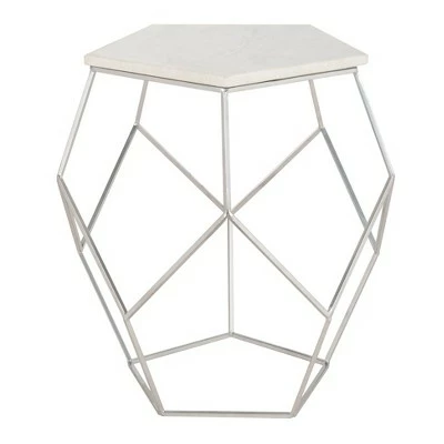 A contemporary sculpture exhibition in NYC inspired this modern pentagon marble top side table. Its bold, dynamic figure blends geometric style with the classic graciousness of marble. Place your drink down or decorate with a vase, flowers, or more. Its silver finish makes it a perfect base and a versatile piece for any living room. This geometric accent table is a wonderful addition for modern and contemporary styles. It does not require any assembly and is instantly ready for any room.