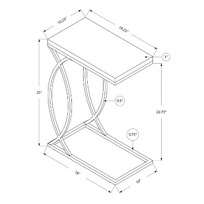 Pass the popcorn no more with this 24.5-Inch C Shaped Accent Table from Monarch Specialties that handily keeps snacks within arm’s reach while you watch TV. With a C-shaped metal frame, this accent table features a base designed to be placed under furniture, bringing the tabletop surface closer to you when seated. Featuring an interesting circle design, this stylish table can easily slide around couch arms and beds for an extra surface at arm’s reach. Whether used in a living room or bedroom this versatile accent table is a great choice for rooms with limited space. Finished on all sides, it can be positioned with either side facing forward.Small in size yet big in functionality, this table is a lightweight 8 pounds, so you can easily carry it to wherever you need a space-saving end table with style. With its laminated top in an elegant, black finish and sturdy metal coordinating frame, this 24.5-Inch C Shaped Accent Table from Monarch Specialties will bring a clean, modern look to any room.