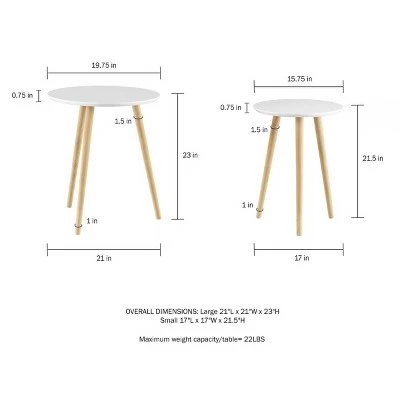- PRODUCT DETAILS- Material: MDF and Pine wood. Large Table Dimensions: 21″ L x 21″ W x 23″ H. Top Dimensions: 19.75″ D x.75″ H. Small Table Dimensions: 17″ L x 17″ W x 21.5″ H. Top Dimensions: 15.75″ D x.75″ H. Weight Limit: 22 LBS Each. Color: White, Natural.