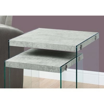 Featuring a chic gray cement-look surface, this 2pc nesting table set adds exceptional style to any room. The unique tempered glass base provides sturdy support as well as a contemporary look. Use this multi-functional set as end tables, lamp stands, decorative display units, or simply as accent pieces in your living room, family room, den, or office space.