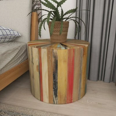 - This reclaimed wood side table comes in a cylindrical design showcasing its natural wood grain patterns in a rustic style inspired design