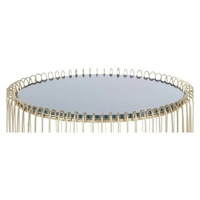 - This contemporary style inspired design round metal and glass accent table features a creative cylindrical design made from painstakingly attaching iron rods to two circular rings and topping it off with a black glass surface