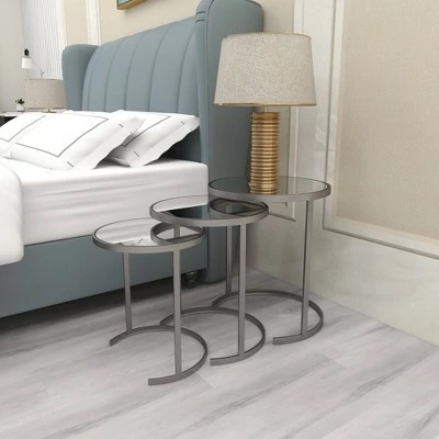 The mirrored tables are perfect for displaying shiny decor in your living room. Bring a finishing touch to your home with an inviting appeal with this beautifully crafted accent table. A compact friendly table providing you with additional storage space any where in your home. Suitable for indoor use only. Maximum weight limit is 100 lbs. Each set comes with three tables in three different sizes. Contemporary design.