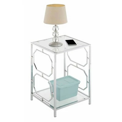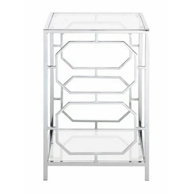 Distinctive elegance is the best way to describe the Omega Chrome End Table with Shelf by Breighton Home. It features a modern contemporary style that will fully elevate your current living room decor. The combination of straight lines and two octagonal cut outs adorning each side frame, make this accent piece a showstopper. This two tier unit does not fall short on functionality. With two shelves that will optimize your storage and display space, you will have the freedom to exhibit your favorite collectibles meanwhile using the tabletop to keep your favorite cup of coffee. And that is not all! This elegant glass table is crafted from durable materials. The frame is made from chromed metal which makes it long lasting and easy to maintain. Both the tabletop and bottom shelf are made from clear tempered glass which makes them easy to clean. Bring home today and enjoy its simple 4 step assembly! Part of the Omega Collection by Breighton Home. Complete the look with the Omega Chrome Coffee Table with Shelf and the Omega Chrome Console Table with Shelf. Each sold separately.