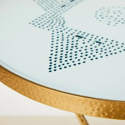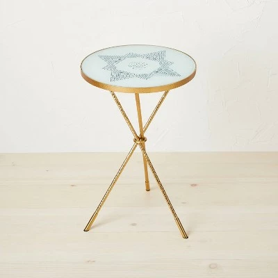 Update your living room decor with the fun, functional style of this Carlina Pattern Glass-Top End Table from Opalhouseâ„¢ designed with Jungalowâ„¢. This metal and glass end table features an iron base with a shiny gold-coated finish, along with a round glass tabletop decorated with a star pattern. The 24-inch height and small footprint make this three-legged end table perfect for placing at the end of your sofa or next to an armchair, so you and your guests can use it to rest a drink or snack while entertaining. You can also stack it with a couple books and a potted plant for a charming addition to your home decor.