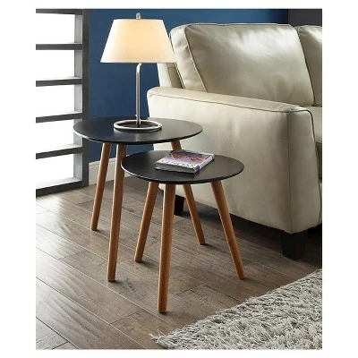 Inspired by Mid Century Styling the Oslo Nesting End Tables will transform your space. This set of two offers a ton of versatility and functionality. Perfectly nested together you can use the smaller table as an extended surface and tuck it away when you are done or as a completely different unit. This set comes in a variety of finishes from a beautiful satin to a lovely woodgrain finish. Featuring solid wood legs and easy assembly you will have this set together and ready to use in no time! Look for other items from the Oslo Collection sold separately.