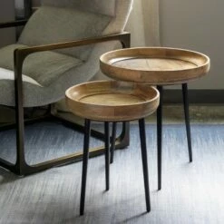 Made of beautiful mango wood and accented with black iron legs, this set of 2 round occasional tables have a mid-century rustic appeal. Use separately when you need more entertaining surfaces; the perfect size for drinks and snacks.