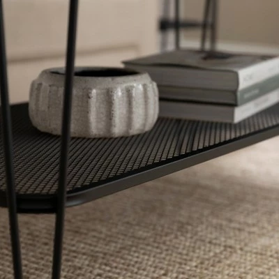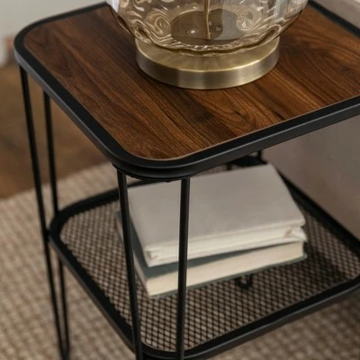 Add an urban industrial element into your home with this mixed material hairpin leg side table from Saracina Home. Wherever and however you want, this accent stand allows you to incorporate a masculine component into a variety of room styles. Use it as a nightstand or end table beside your sofa. The lower metal mesh shelf creates extra storage space that makes a great home for Bluetooth speakers, books, or a convenient stash of your favorite candy. Hairpin legs create a compelling silhouette. Complete the collection with the matching coffee and entryway table options.Overall Width: 16 inchesOverall Height: 24 inchesOverall Depth: 16 inchesHeight from floor to Shelf: 11.25 inchesHeight from shelf to table: 12.16 inchesTabletop Thickness: .63 inchesShelf Thickness: .63 inches