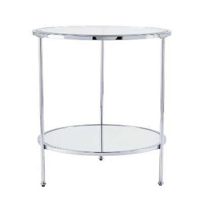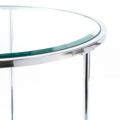 Master the 1920’s scene with the Aiden Lane Ric End Table. The sleek metal frame houses a wide-beveled glass tabletop and black glass shelf. Glamorous dreams come to life with this round side table.