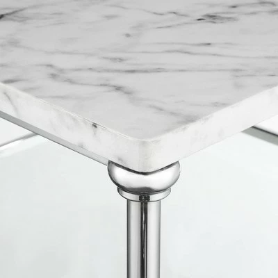 Add elegance to your living space with the Roman II End Table with Shelf by Breighton Home. The noteworthy construction was fashioned from materials that create a beautiful contrast. From the white faux marble tabletop to the clear tempered glass shelf held together by a chromed metal frame, this two tier unit will keep your guests in awe and become a staple in your home immediately. The white faux marble tabletop was made from MDF and paper with UV paint, making it glossy and easy to clean. Rest assure that the sturdy frame can hold your favorite lamp and your living room essentials. Its modern glam style will transform your home decor while keeping it in vogue. Use in your home office or den and witness its endless versatility. Bring home today and enjoy this unique piece in no time with its 5 step assembly! Ready for more? Look for the Roman II Square Coffee Table with Shelf by Breighton Home. Each sold separately.