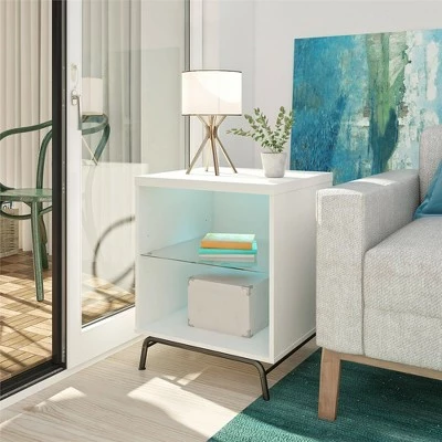 Step away from the ordinary and give your living room a modern makeover with the Room & Joy Hannaford End Table. This End Table features LED lighting with 7 different color settings for a fun and funky look for your entertainment space. But the modern touches don’t stop there. The 2 open shelves, 1 glass, can organize remotes, magazines, or other electronics so you have everything you need for family movie or game night. This Table has a mix of laminated particleboard and MDF with metal feet and tempered glass shelving. Combined together this Table makes for a very sturdy addition to your room. The Table ships flat to your door and requires assembly upon opening. Two adults are recommended to assemble. After assembly, the Table measures to be 26”H x 21”W x 19.625”D.