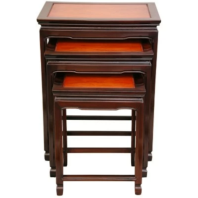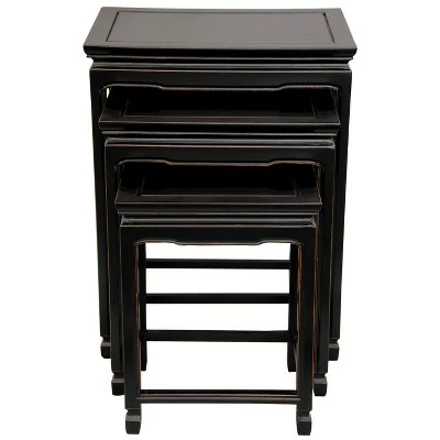 A fine quality set of three nested tables, convenient for drinks, snacking, or dining in the living room, family room, or office. They’re elegant decorative accessories, lending a subtle Asian accent with a beautiful distressed, antiqued black lacquer finish. The 3 descending table sizes can provide unique decorative stands for plants, planters, sculptures, photos, or curio display, as well as more traditional drinking and snacking.