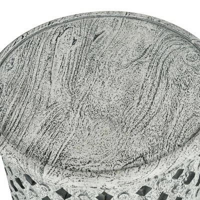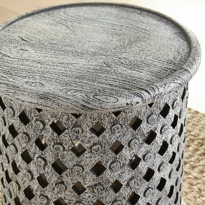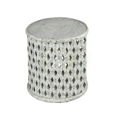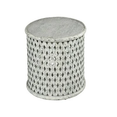 Subtle hints of BoHo styling emerge in the hand-crafted Samir End Table. The aged alabaster finish gives it a welcoming and well worn feel while the latticework base adds to it’s unique style. The 17″ round shape fits easily anywhere you need a pop of style or resting place for books, drinks, etc. Your purchase includes one end table.