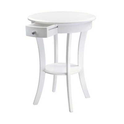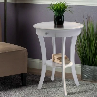 Add this charming Sasha Round Accent Table from Winsome to your living space for a refined look you’ll love. Featuring a round tabletop and flared legs, this white side table has a unique, fanciful look, and the single drawer is finished with a metal drawer pull for a touch of extra detail. The built-in shelf is perfect for books or decor, and the wooden construction makes it strong and stable. Place it in your living room or den to create a curated look that displays your unique taste.