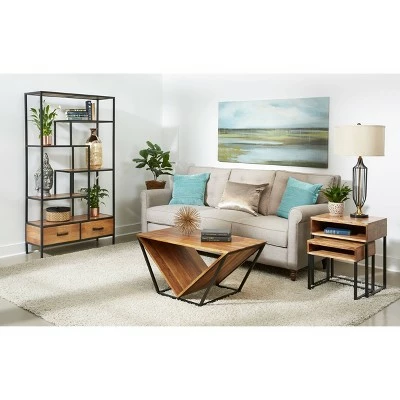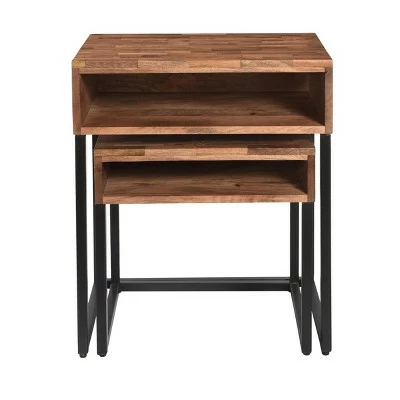 With one nestled under the other, or pulled apart, there are so many possibilities and places that this set of two Nesting Tables can be used! Made of mango wood which has been finished in a rich Baker’s Natural, the tops have an open compartment where you can easily store books or magazines, keeping them within easy reach. The top surfaces have intricate pieced together designs, and both have a wonderful open metal base which has been powder coated a deep black. A dynamic duo!
