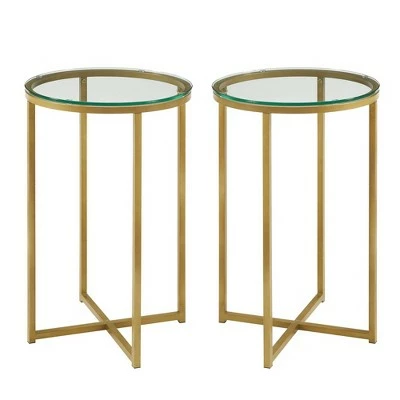 Add a splash of modern style to your living room with the Vivian Glam X-Leg Round Side Table Set by Saracina Home. Mixed materials and finishes make for an end table duo that will instantly glamourize your space, complement your dĆ©cor, and set the stage for drinks and snacks. The geometric, X-style legs contrast the round top surfaces and create contemporary, harmonious silhouettes. Stylish and practical, these circular accent tables also include caps on the metal legs to protect your flooring from wear and tear. Tie the room together by pairing these pieces with Saracina Homeās matching coffee table.