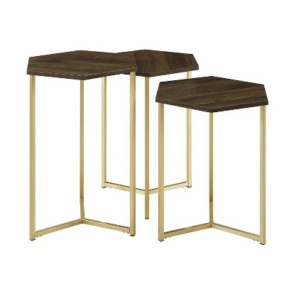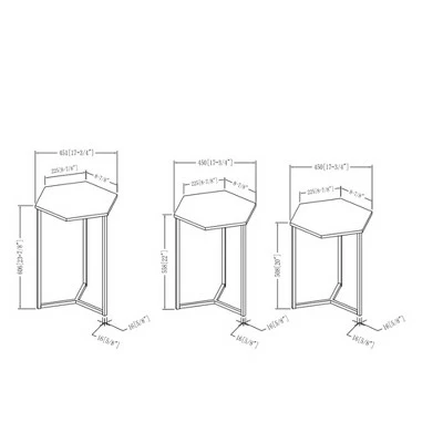 Include these three side tables from Saracina Home in your home for a unique and inviting appeal. With a hexagon shape table top, each of these side tables can be used together to create a coffee table with originality, or used apart in your living room or bedroom. These can also be nightstands in your bedroom if you want to incorporate a modern style. These transitional side tables can display your décor, plants, or keep a lamp for reading. With a metal x-shaped base and laminate table top. Set includes three tables of varying sizes.