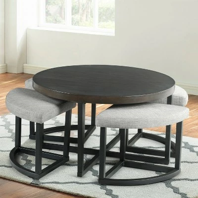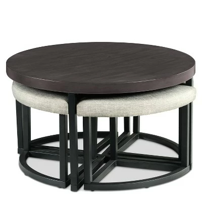 The dual purpose Yukon Coffee Table Set features a cocktail table and four upholstered stools that can be used at the table or as a free-floating seat within a room. The triangular stools store easily in the base of the table and feature a light gray, linen-look seat for added comfort. The walnut finish and ebony iron metal add a fashionable appearance to this highly functional Occasional set. Your purchase includes one cocktail table and 4 stools.