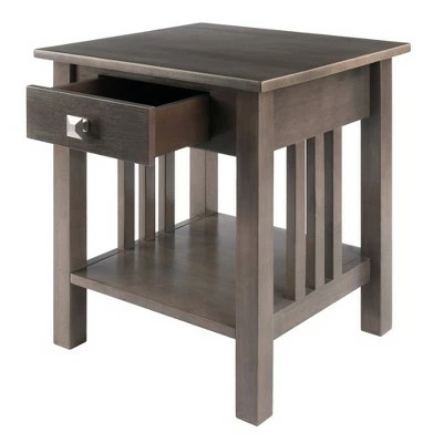 A handsome blend of classic and contemporary styling enables the Winsome Wood Stafford End Table to complement any decor. The mission-like slatted side panels create an open feel while the oyster gray finish gives it a modern touch. Featuring one drawer making this accent table just right by your bedside for a reading lamp, storing small personal accessories out of sight, yet within easy reach for your convenience. The drawer is tastefully accented with a beveled silver-finish pull. An open lower shelf is ideal for keeping books and magazines. Use this all-around end table in the living room next to the sofa or a printer stand in your home office. For larger beds, sofas or rooms, try adding one accent table on each end and coordinate with other furnishings from the Winsome Stafford collection for a cohesive look throughout your home (each sold separately). Solid and composite wood construction for long-lasting beauty and durability. Conveniently packed and shipped in 1 box that includes the hardware necessary for assembling. Replacement part request can be submitted directly to the manufacturer within 60 days from date of purchase.