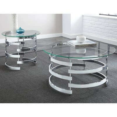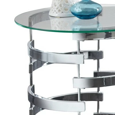 Contemporary style meets functionality with this Teegan End Table from Steve Silver Co. This circular end table has a unique cut-out shiny chrome frame that creates an open and airy design. It has a tinted glass top that’s perfect for displaying a variety of different decor. This circular glass and chrome end table is perfect for displaying decor next to a couch, armchair or in any living space in your home.