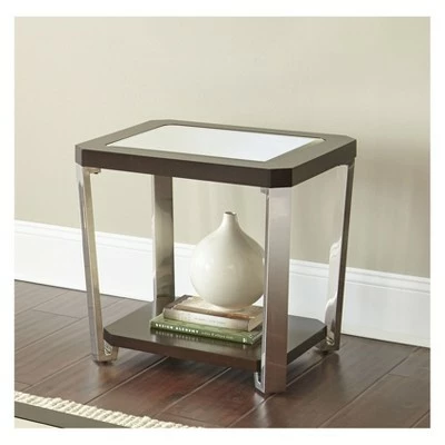 Bring contemporary style to your home with the Truman End Table from Steve Silver. Carved with a sturdy metal frame, wood tabletop with a mirror insert, and a wooden bottom shelf, this espresso end table offers a classic mix of sleek style and functional use. This silver accent table lends an open, airy statement while giving any room in your home some extra style.