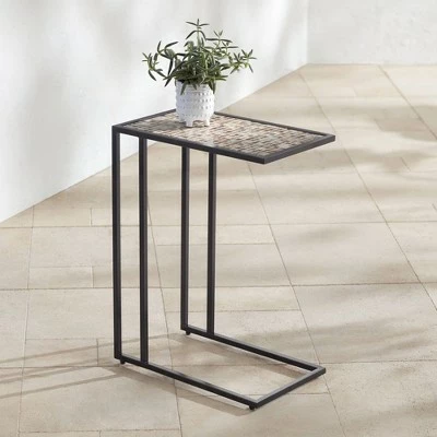 Hold drinks, reading material and more on this handsome mosaic table. The frame is c-shaped, designed so that it can be pulled under chairs or sofas to bring the table surface closer to you. The top features white and brown color tiles that have been hand applied. Can be used indoors or outside.