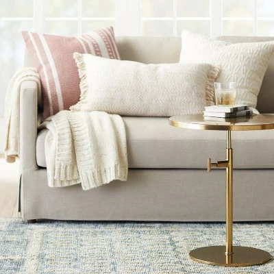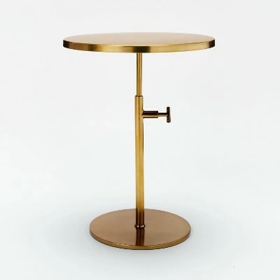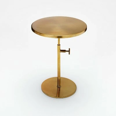Spruce up the look of your decor by accenting it with this Adjustable Brass Accent Table from Thresholdâ„¢ designed with Studio McGee. Made from metal, this round accent table is supported by a pedestal base with adjusting hardware so you can change the height to suit your needs. The brass finish provides a standout look that easily integrates into most decor styles and color palettes. You can place this adjustable accent table near your sofa to keep your books and other items within reach while adding a decorative touch to your space.