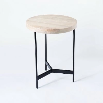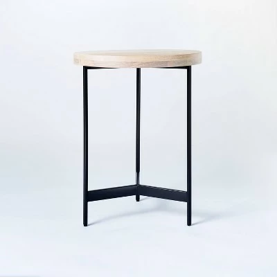Decorate your home in sleek style with this Villa Park Round Wooden End Table from Threshold™ designed with Studio McGee. This brown end table features a wooden top with a black metal frame for an elegant look you’ll appreciate. Use this round end table alongside a sofa to display floral arrangements and more in sophisticated style.