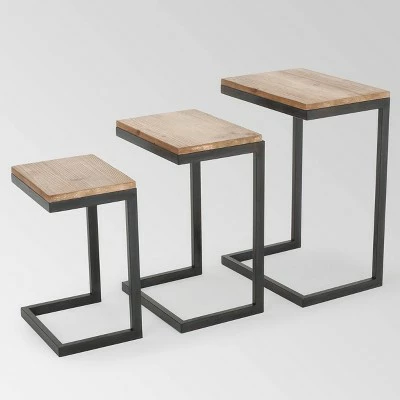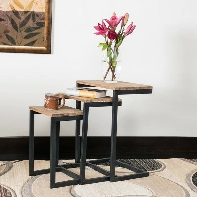 Expand the amount of table space your interior space has to offer without taking up extra room. Including three nested tables, this set offers incredible versatility whenever you need some extra table space. When your guests have gone and you need your living room back, you can simply tuck these tables together for easy storage. Featuring a wonderful C-shaped structure that is built from rich firwood and iron, this nested set will provide outstanding durability and style for years to come.MODERN INDUSTRIAL: Our nesting tables incorporate a powder-coated frame with sleek firwood to create an understated modern industrial design. Featuring smooth metal contrasted by natural wood, this set offers a chic aesthetic to any home.NESTING TABLES: This set of tables can be nested for easy storage when not in use. Cleverly designed to tuck into each other, this set also offers an exquisite structure that elevates the vibe of your decor.C-SHAPE DESIGN: Perfect for use while seated on the couch or in your favorite club chair, the C-shape design allows you to use our table set without any sacrificing leg room.FIRWOOD: The tabletops are created with refined firwood for a resilient structure that features straight, tight grains. This durable wood less prone to warping or twisting due to its dense nature.DIMENSIONS: Choose an accessory that is the perfect size for you and your furniture. The large table is 18.25” W x 12.75” D x 25.25” H, the middle table is 15.50” W x 11.50” D x 22.25” H, and the small table is 12.75” W x 10.25” D x 19.00” H. You will love how much your space can transform with the simple addition of this charming nesting table set.