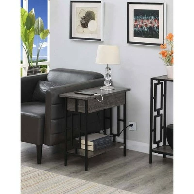 Bring home the functionality of the Town Square Flip Top End Table with Charging Station and Shelf by Breighton Home. Featuring a flip top that reveals a convenient charging station as well as storage space for your remote controls or favorite book. Charging station includes two standard outlets and two USB ports which can easily charge your phone, tablet and even your laptop. The cable management hole allows you to store multiple devices on the table without damaging cords. The power supply cord is 6 feet in length giving you the room you need to display your end table where you choose. Includes a bottom shelf for additional storage or display.