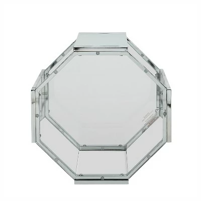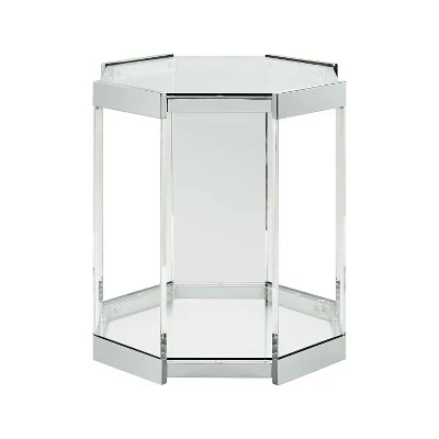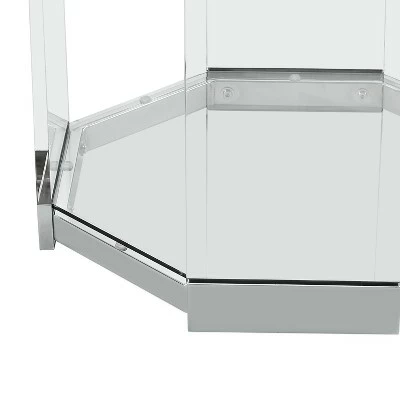 Add this octagon acrylic, metal & glass side table to your favorite room for a sleek, contemporary look. This side table has a clear tempered glass top and shelf with clear acrylic legs. To maintain, simply dry dust to keep this piece looking new. Adult assembly for this side table is required.