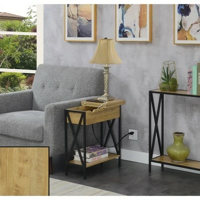 Add functionality to your home with the Tucson Flip Top End Table with Charging Station and Shelf by Breighton Home. The flip-top reveals a convenient charging station as well as storage space for your remote controls or favorite book. The charging station includes two standard outlets and two USB ports that can easily charge your phone, tablet, and even laptop. Also included is the cable management hole which allows you to store multiple devices on the tabletop without the tangling or damaging of cords. This units power supply cord is 6 feet in length giving you the flexibility to display your table where you choose. Additionally, a bottom shelf is also included for storage or display. Modernize your home with coordinating pieces from the Tucson Collection by Breighton Home, each sold separately.