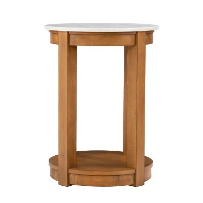Put a stylish spin on your small space with the Aiden Lane Vebell Round End Table. A faux marble tabletop elegantly displays décor pieces or a potted plant, while the lower shelf holds a convenient storage basket or spare blanket. Tuck this round accent table into your entryway as a catch-all for everyday essentials, or slide alongside your living sofa to hold a glass of wine. Take your home design up a notch with this faux marble side table.