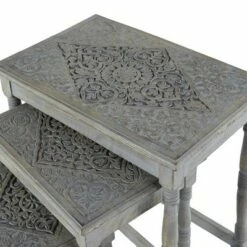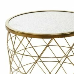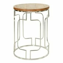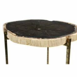 - A brown wooden side table crafted of solid and polished pine wood and iron