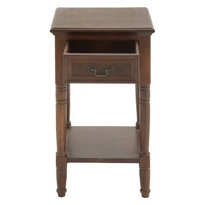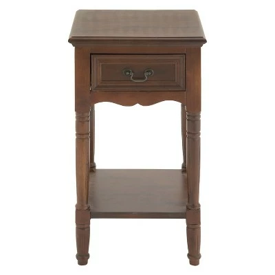 - Mahogany-colored wood side table contains 1 drawer & 1 shelf